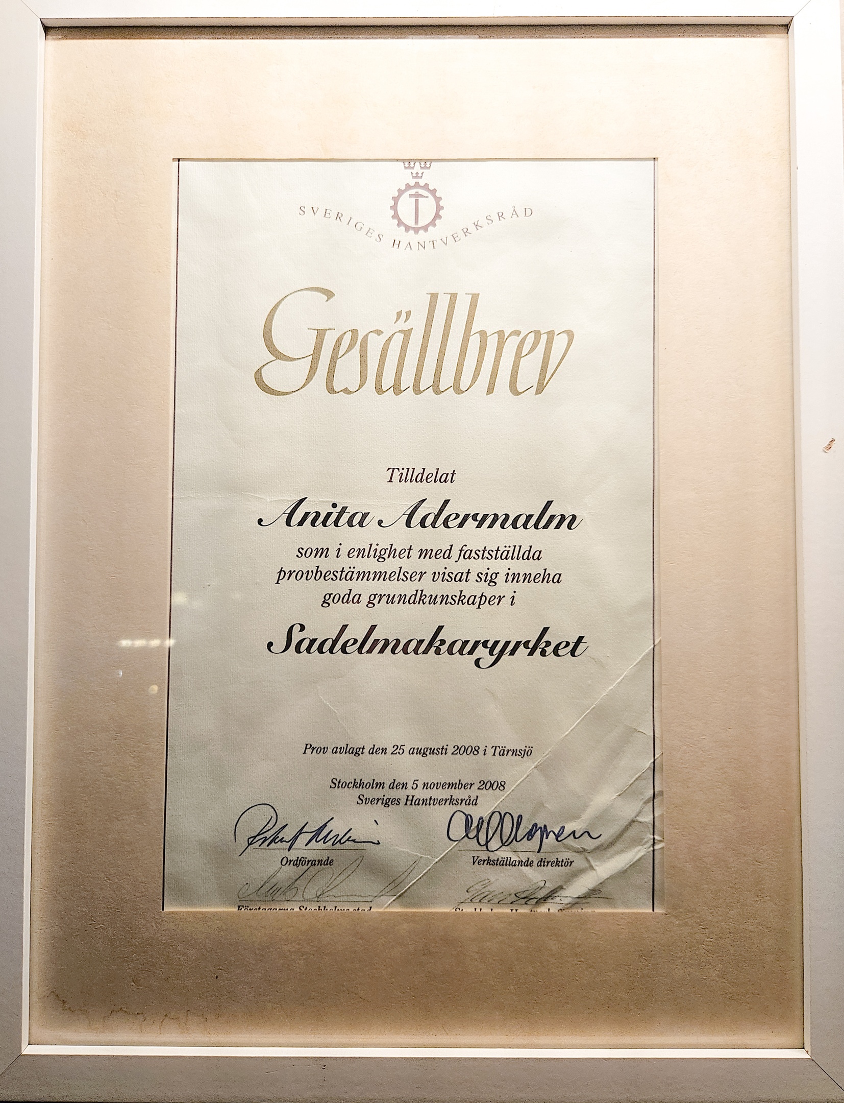 År 2005 startades mitt skapande i läder via Sadelmakeriskolan i Tärnsjö. År 2008 slutfördes det sista provet, ett gesällarbete som bestod av en komplett sele och på hösten fick jag ta emot mitt gesällbrev i Blå Hallen, Stockholms Stadshus.